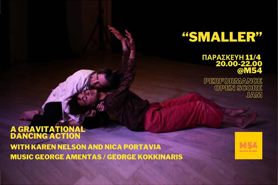 Αυτή η εκδήλωση φέρνει τις διεθνείς προσκεκλημένες καλλιτέχνες-χορεύτριες και εισηγήτριες του Contact Improvisation, τη Nica Portavia και την Karen Nelson, για να παρουσιάσουν το ντουέτο τους “SMALLER” σε συνοδεία ζωντανής αυτοσχεδιαστικής μουσικής από τον Γιώργο Αμέντα.