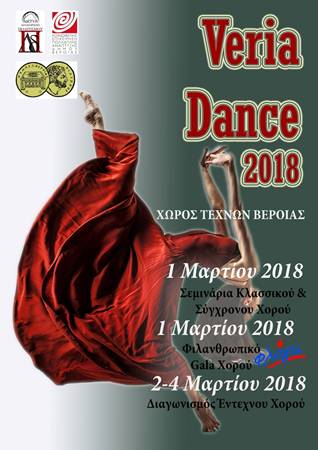 Το Δίκτυο Διαχείρισης Πολιτισμού σε συνεργασία με την ΚΕΠΑ Δήμου Βέροιας και υπό την αιγίδα του Δήμου Βέροιας διοργανώνουν από 1 εως 4 Μαρτίου 2018 στο Χώρο Τεχνών Βέροιας το «Veria Dance 2018». Η διοργάνωση περιλαμβάνει τοn Πανελλήνιο Διαγωνισμό Χορού «Veria Dance Competition 2018» στον κλασσικό, σύγχρονο, νεοκλασσικό και καρακτέρ, ο οποίος θα πραγματοποιηθεί σε δύο φάσεις (ημιτελικός –τελικός) στις 2, 3 & 4 Μαρτίου 2018. Μπορούν να συμμετάσχουν μαθητές ερασιτεχνικών σχολών χορού από 7 ετών και άνω, καθώς επίσης και μαθητές επαγγελματικών σχολών χορού και επαγγελματίες.