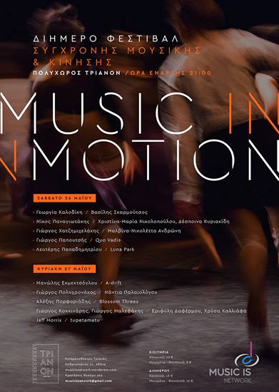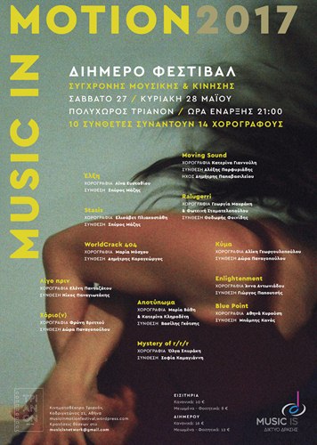 Το φεστιβάλ MUSIC IN MOTION είναι η μοναδική πλατφόρμα στην χώρα μας που φέρνει σε επαφή καλλιτέχνες του χορού με δημιουργούς σύγχρονης μουσικής, με σκοπό να προκύψουν πρωτότυπες χορογραφίες πάνω σε σημερινά μουσικά έργα.