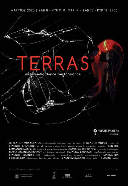Τo TERRAS αντηχεί στον καθένα ξεχωριστά και εμπνέει τη μεταμόρφωση, μέσα από την κίνηση του σώματος, την ποιητικότητα της εικόνας, την υπερβατικότητα του ήχου. Συνδυάζοντας την τέχνη του χορού με εικαστικές πρακτικές, η εγκατάσταση - παράσταση αναπτύσσεται μέσα σε ένα κινούμενο εικονικό σύμπαν που κατασκευάζεται από την κίνηση, τον ήχο, την ψηφιακή εικόνα, το φως κι ένα μεταβαλλόμενο σκηνικό - κοστούμι. Όλα τα στοιχεία ενεργοποιούν το σκηνικό χώρο, αναδεικνύοντας ποικίλες πτυχές του κατασκευασμένου τοπίου και στιγμές που ζητούν να αναδυθούν μέσω του σώματος.