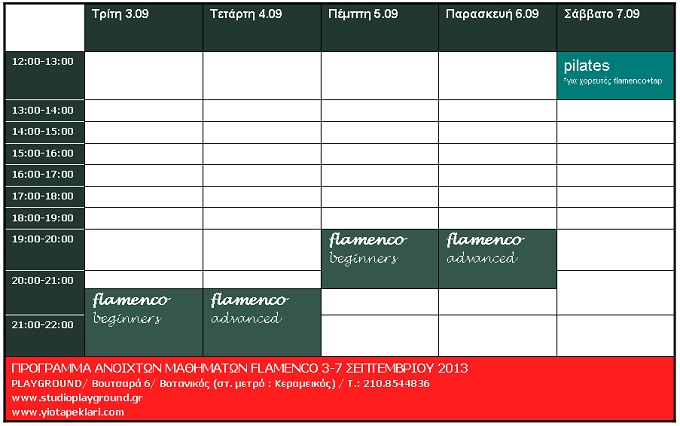 Από τις 3 μέχρι τις 7 Σεπτέμβρη 2013 μπορείτε να συμμετέχετε στα ανοιχτά/δωρεάν μαθήματα flamenco που διοργανώνονται κάθε χρόνο, ετσι ώστε να έρθετε σε επαφή την ιδιαίτερη μέθοδο διδασκαλίας που ακολουθείται.